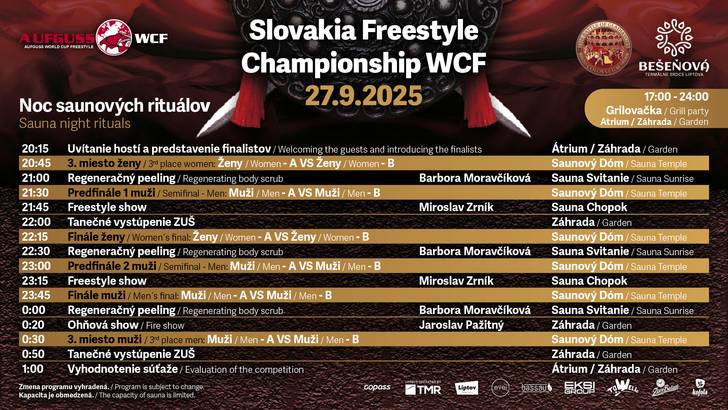 Enjoy gladiator battles in saunas and experience an unforgettable night! In Bešeňová, the second Slovak qualification round of THE BATTLE OF GLADIATORS takes place as part of the AUFGUSS WORLD CUP FREESTYLE under the patronage of the Bešeňová water park and multiple world champion Rob Keijzer from the Netherlands. The Sauna temple will be transformed into a battle arena where the best sauna masters of Slovakia will compete in a freestyle sauna contest. Men as well as women will compete in their categories and the top places in each category will advance to the grand finale of THE BATTLE OF GLADIATORS. Join us in the arena and enjoy the sauna artistry where the best sauna masters will meet in a thrilling competition full of adrenaline and masterful rituals.