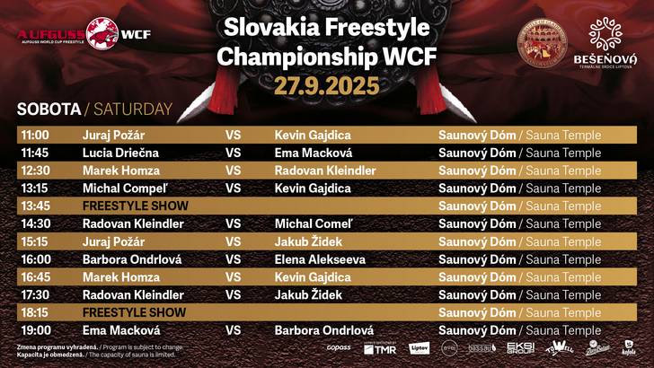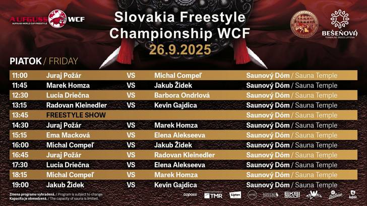 Enjoy gladiator battles in saunas and experience an unforgettable night! In Bešeňová, the second Slovak qualification round of THE BATTLE OF GLADIATORS takes place as part of the AUFGUSS WORLD CUP FREESTYLE under the patronage of the Bešeňová water park and multiple world champion Rob Keijzer from the Netherlands. The Sauna temple will be transformed into a battle arena where the best sauna masters of Slovakia will compete in a freestyle sauna contest. Men as well as women will compete in their categories and the top places in each category will advance to the grand finale of THE BATTLE OF GLADIATORS. Join us in the arena and enjoy the sauna artistry where the best sauna masters will meet in a thrilling competition full of adrenaline and masterful rituals.